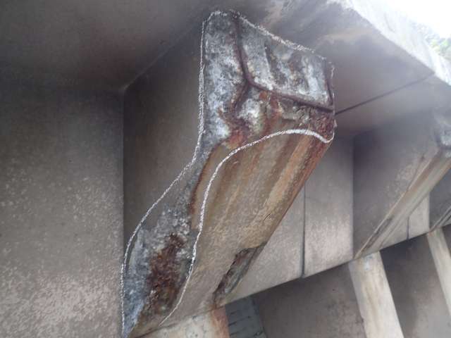 劣化期(剥がれ落ち):コンクリートが剥がれ、中の鉄筋が露出してボロボロになっている。