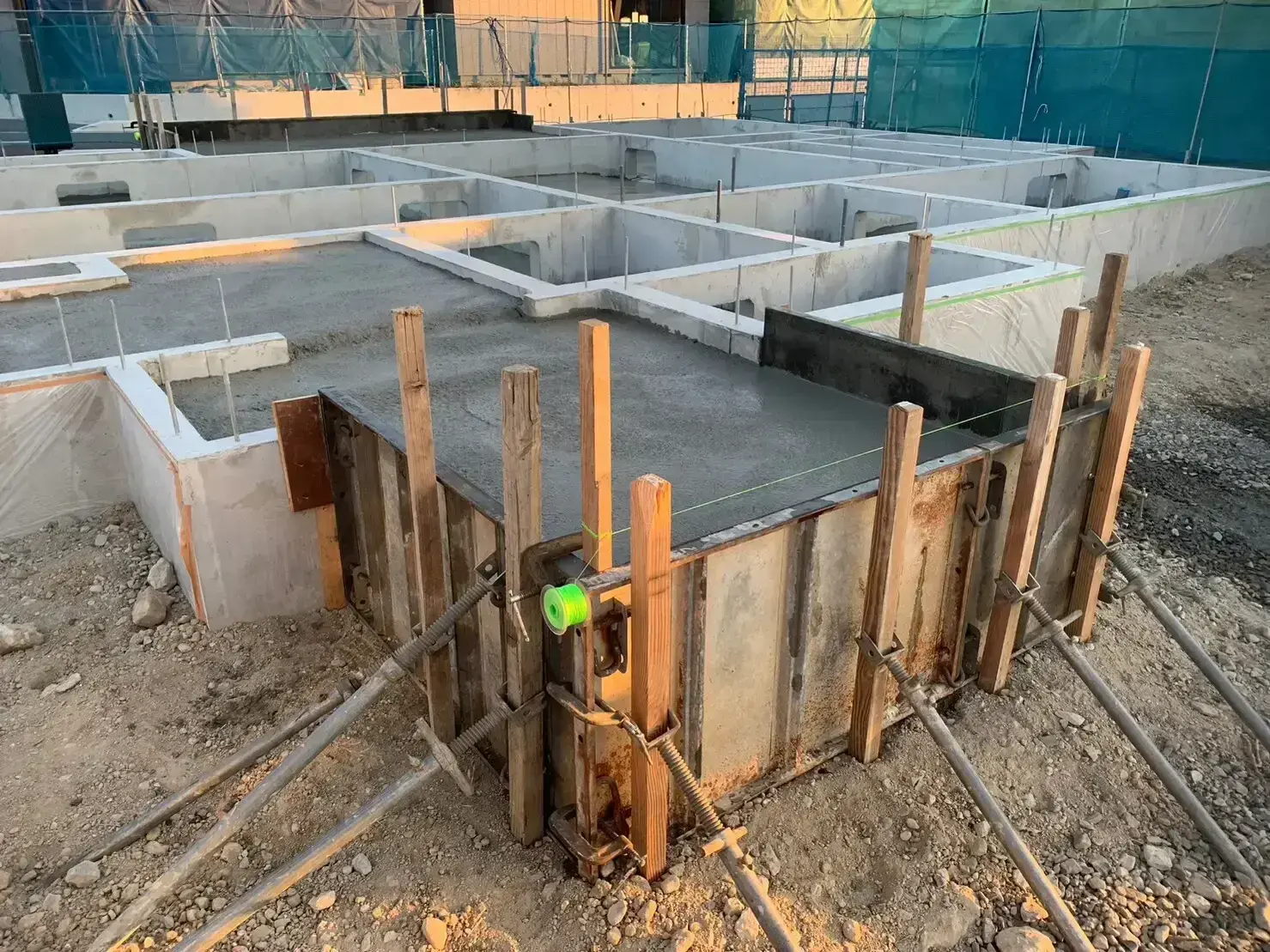 基礎の外周にコンクリートが漏れないように型枠を組み、ベース部分のコンクリートを打設していきます。